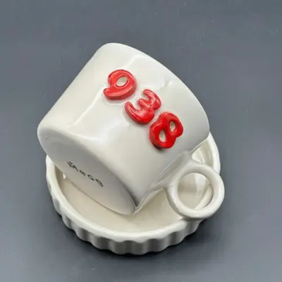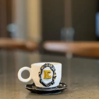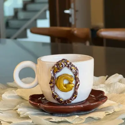 90ml Kişiye Özel Gold Kahve Çerçeve Harfli Türk Kahvesi Fincanı Çiçek Altlığı İle