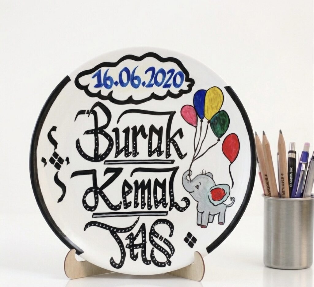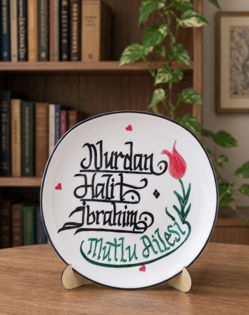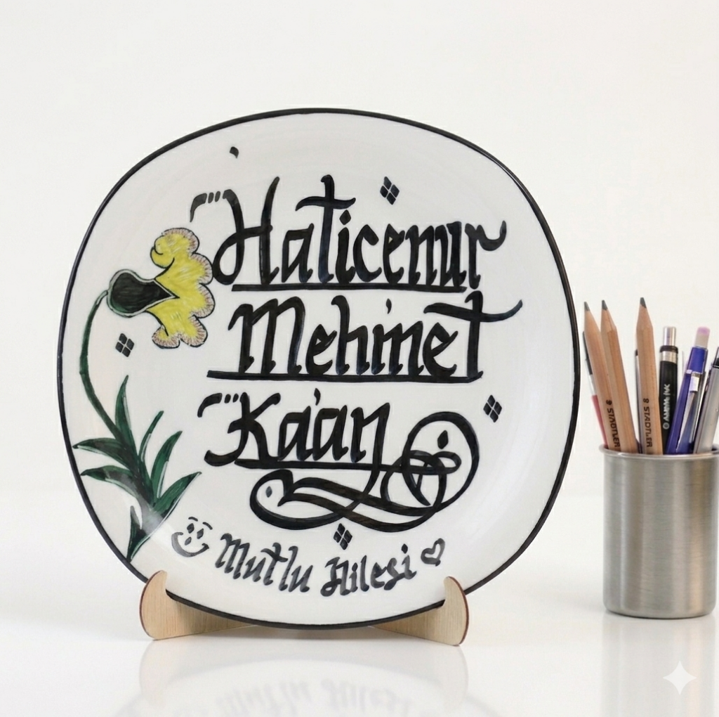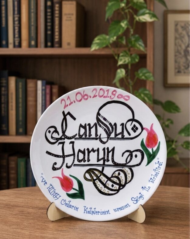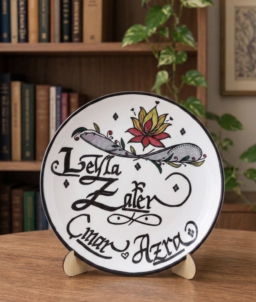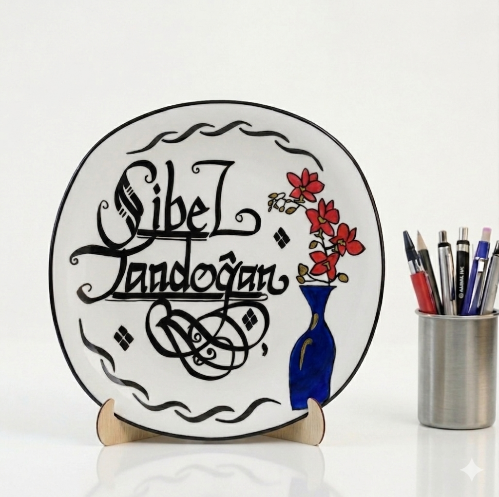 Vazoda çiçek desenli isme özel kaligrafi tabak