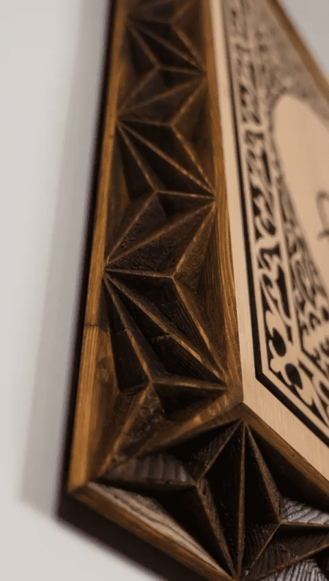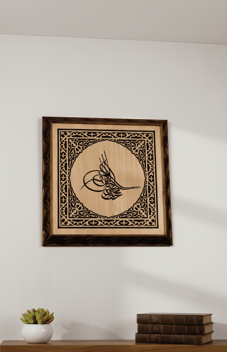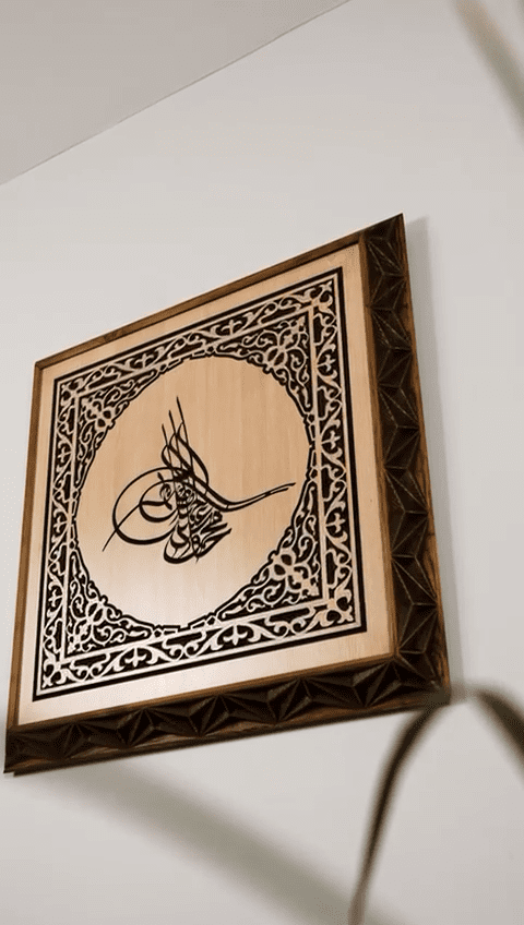 Çambalı Sanat atölyesinde üretilen her ahşap duvar tablosu gibi bu tasarım da önce CNC oyma tekniğiyle hassas şekilde işlenir, ardından detaylı el işçiliğiyle zımparalanır ve son dokunuşları yapılır. Bu sayede her Osmanlı tuğrası ahşap duvar dekorasyonu, aynı modelden üretilse bile ahşabın damar yapısı, ton farkları ve yüzey dokusu sayesinde kendine özgü bir karakter kazanır. Seri üretim hissinden uzak, butik bir İslami duvar dekorasyon ürünü ortaya çıkar.