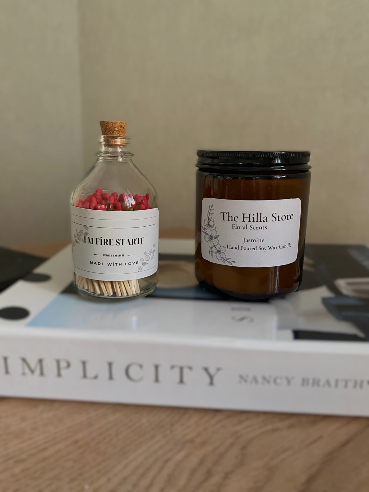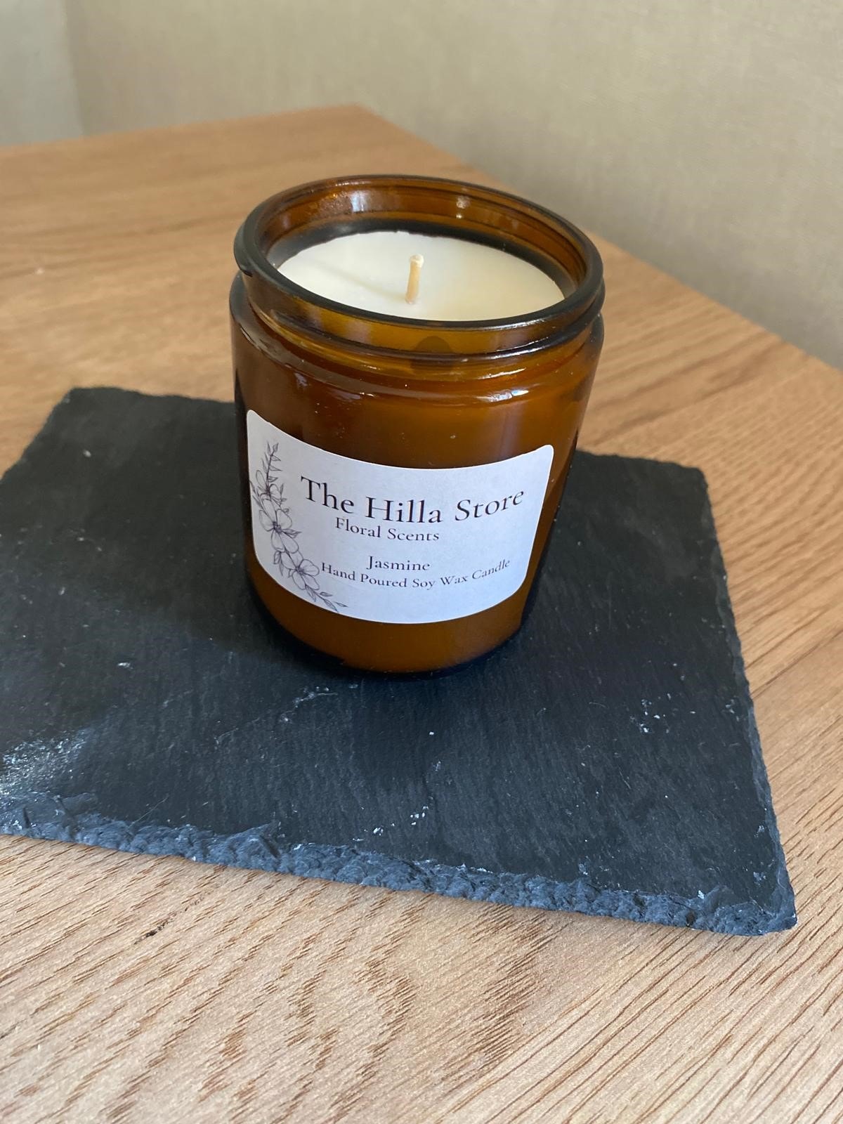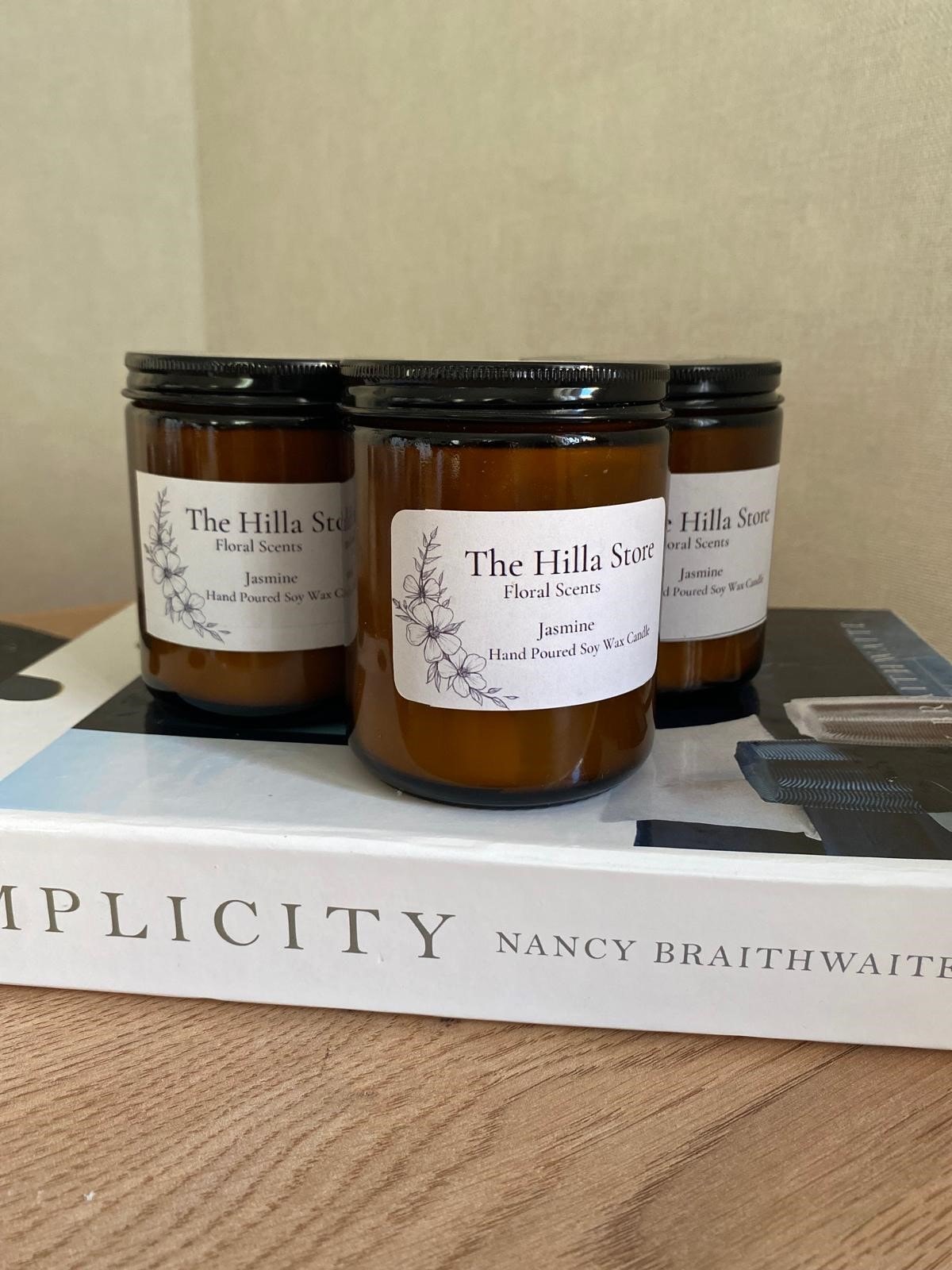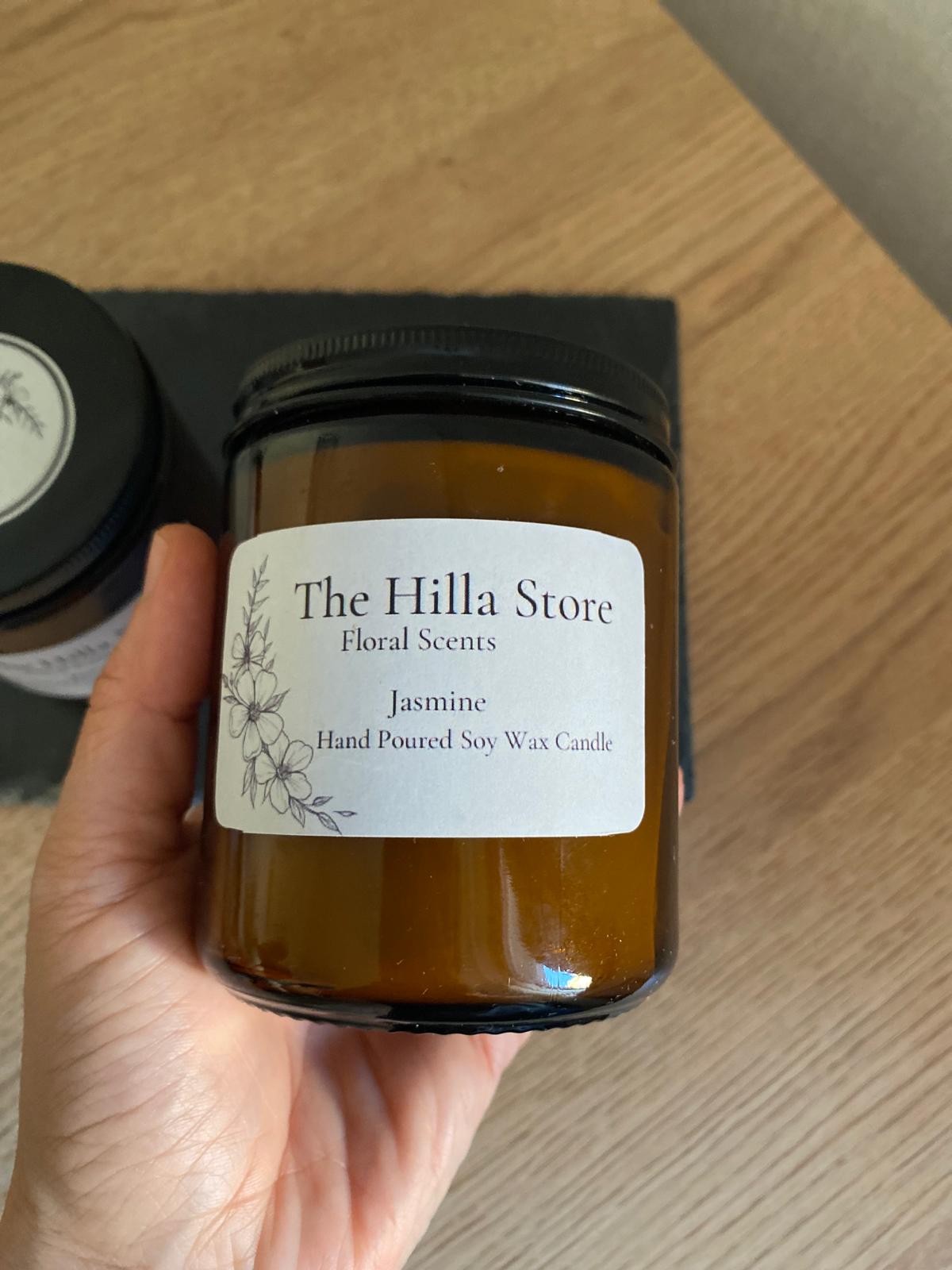 Bu özel aromaterapi kokulu mum, şık bir amber kavanoz içerisinde sunulmakta olup, estetik bir görünüm için zarif bir siyah kapak ile tamamlanmıştır. Her bir mum, %100 el yapımı olarak üretilmekte ve bu sayede her bir ürün kendine özgü bir karakter taşımaktadır. Ürün etiketinde “The Hilla Store” markası, “Floral Scents” kategorisi, “Jasmine” kokusu ve “Hand Poured Soy Wax Candle” ibaresi yer almakta, bu da ürünün kalitesini ve el işçiliğini vurgulamaktadır.