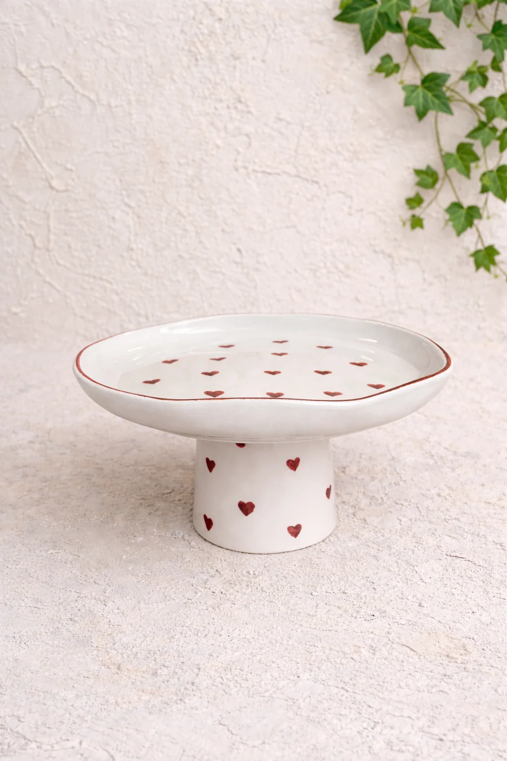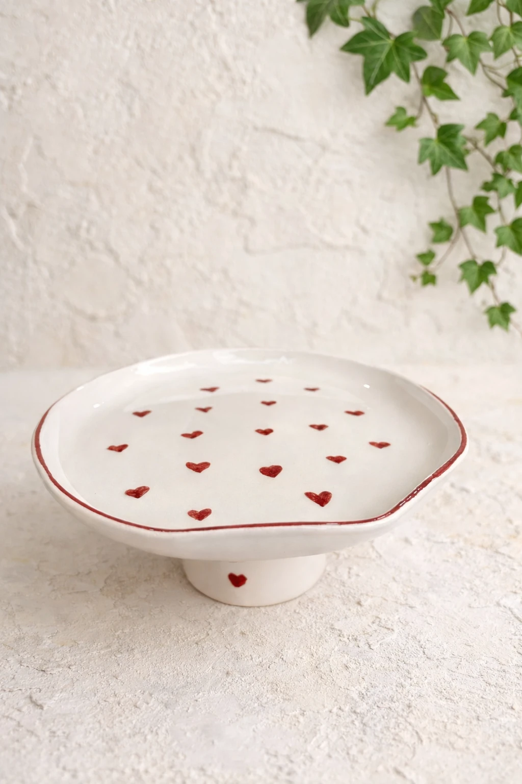 Sofralarınıza zarafet ve romantik bir dokunuş katacak Kalbim Ayaklı Sunumluk, krem rengi zemini ve el işçiliği kırmızı kalp detaylarıyla öne çıkar. Meyve, tatlı, kurabiye ve özel ikramlar için ideal olan bu şık parça; ayaklı formu sayesinde sunumlarınıza yükseklik ve estetik kazandırır.
