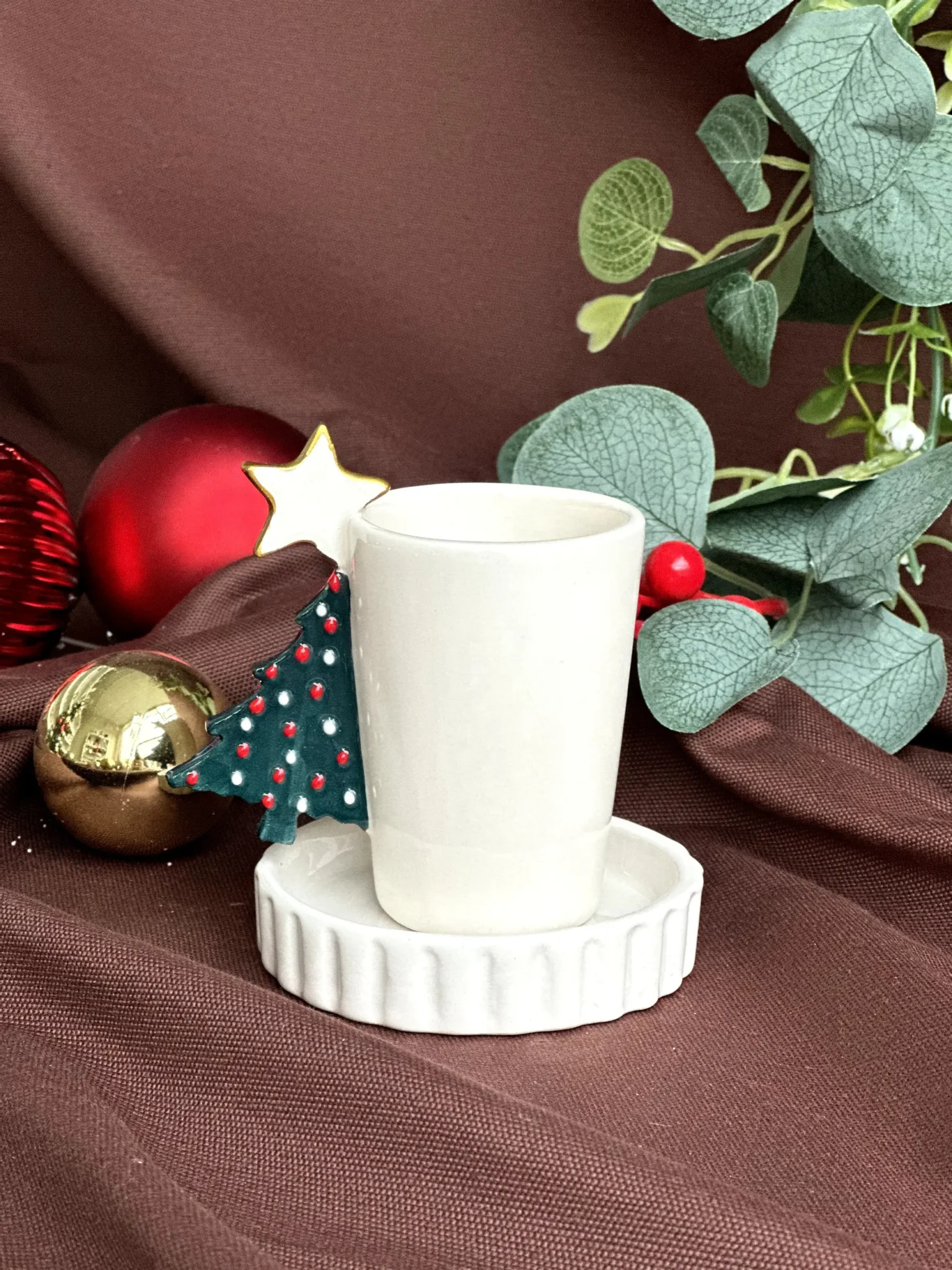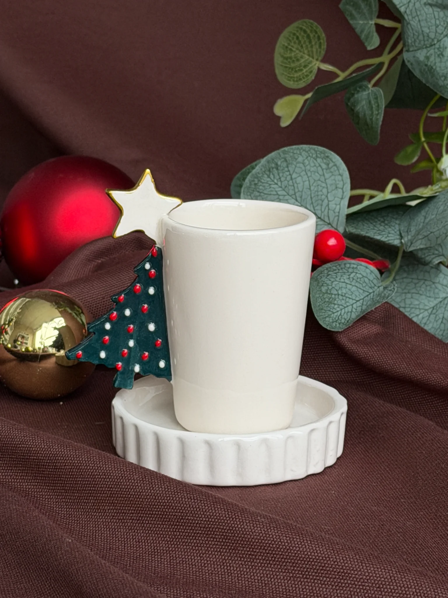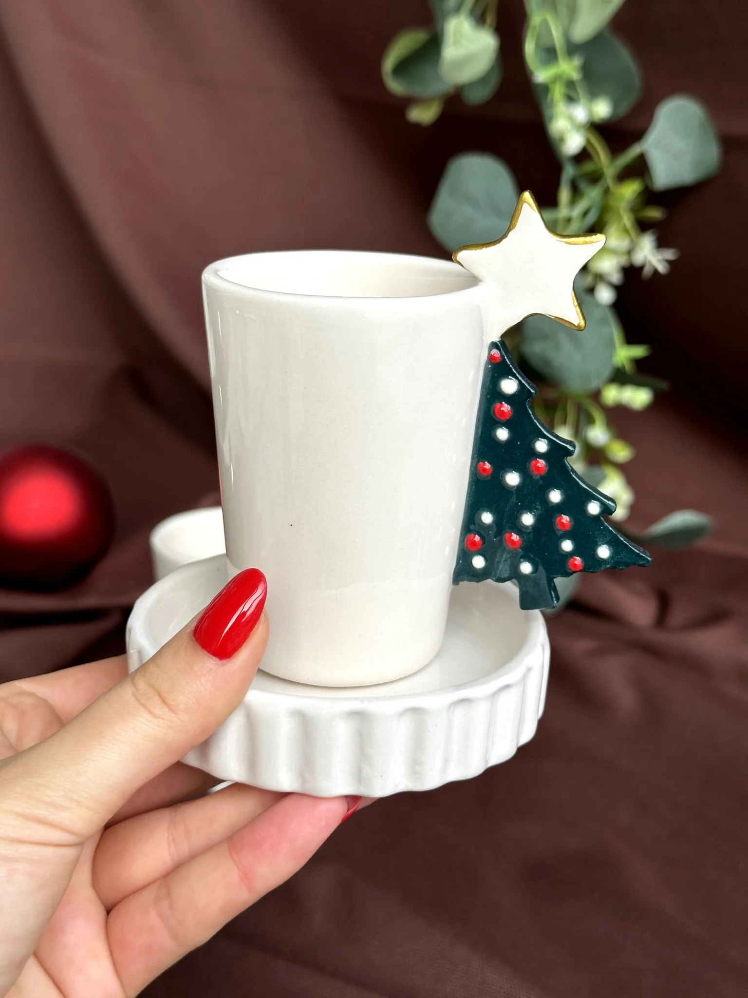 Çam Ağacı ve Yıldız Detaylı Fincan ÜRÜN BOYUTU; YÜKSEKLİK: 8 CM KARGO SÜRESİ 10-15 GÜNDÜR.. FİNCAN ALTLIĞI DAHİLDİR.