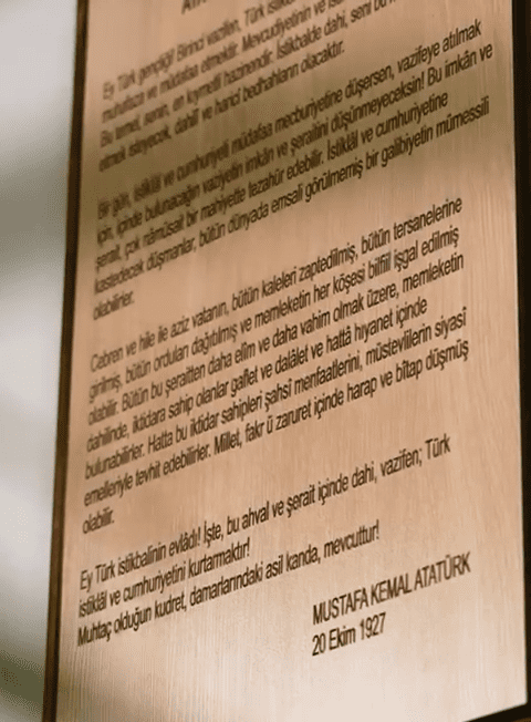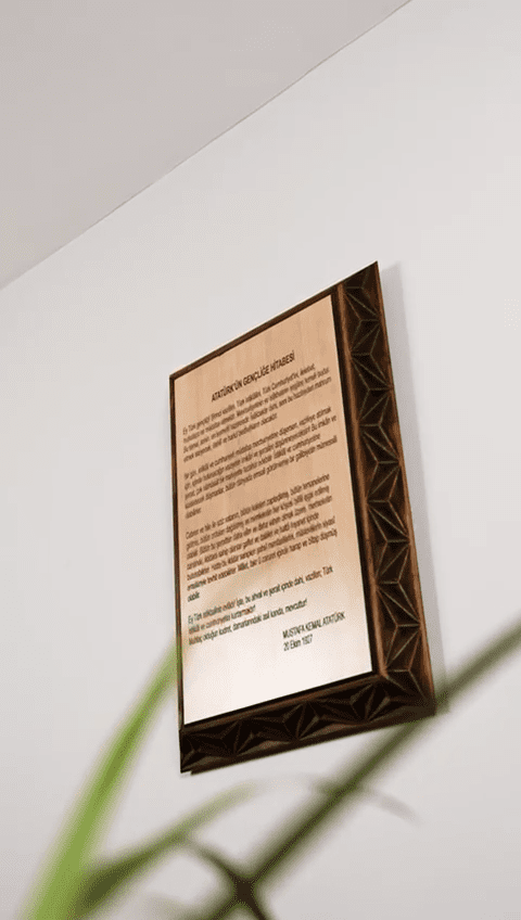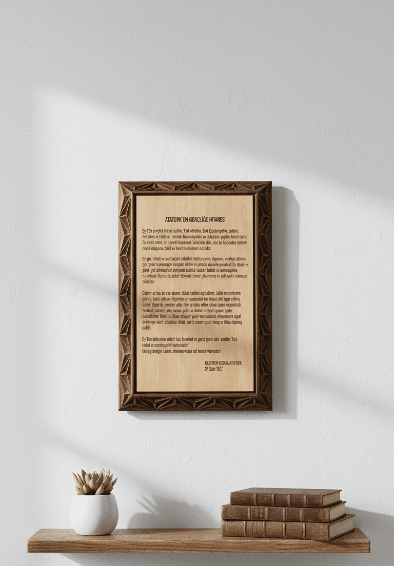 Ayrıca hediyelik olarak da son derece uygundur. Gençlere, öğretmenlere, eğitimcilere veya Cumhuriyet değerlerine gönülden bağlı kişilere anlamlı ve uzun ömürlü bir armağan sunmak isteyenler için Gençliğe Hitabe yazılı bu ahşap duvar dekoru, şık ve unutulmayacak bir tercihtir. Uygun bir ışıklandırma ile kullanıldığında, yazı daha belirgin hale gelir ve mekâna sıcak, karakterli ve ilham verici bir atmosfer kazandırır.