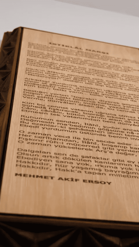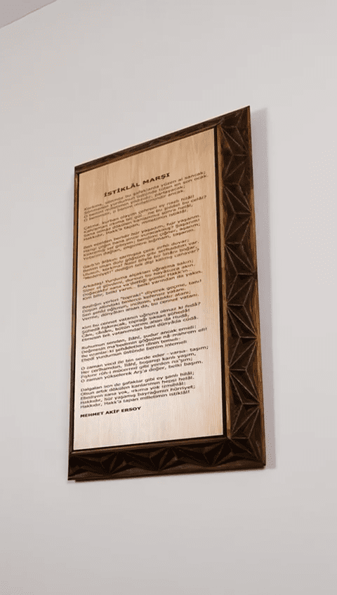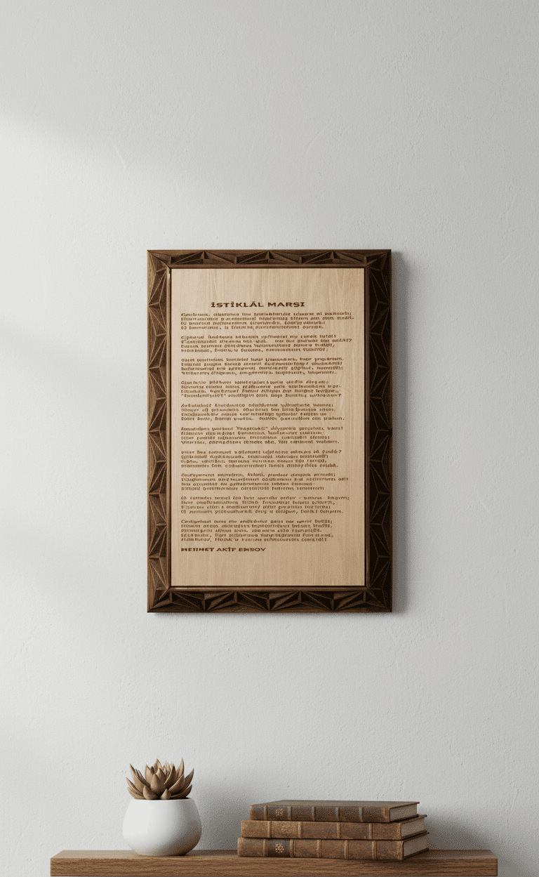 Ayrıca hediyelik olarak da son derece uygundur. Öğretmenlere, idarecilere, öğrencilere, kamu çalışanlarına veya İstiklal Marşı’na özel bir bağlılık duyan herkese verilebilecek anlamlı ve uzun ömürlü bir armağandır. Doğru ışıklandırma ile kullanıldığında, yazının formu ve ahşabın dokusu daha belirgin hale gelir; bulunduğu ortama sıcak, karakterli ve ilham verici bir atmosfer kazandırır.