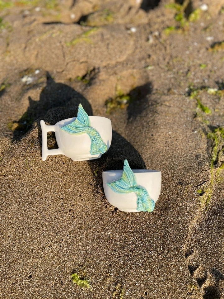 Bu özel tasarım El Yapımı Deniz Kızı Seramik Kase Seti, deniz kızı figürlerinden ilham alınarak tamamen elde şekillendirilmiş ve sırlanmıştır. 300ml kapasiteye sahip bu kaseler; kahvaltılık, meze, tatlı veya çerez sunumları için ideal bir boyuttadır.