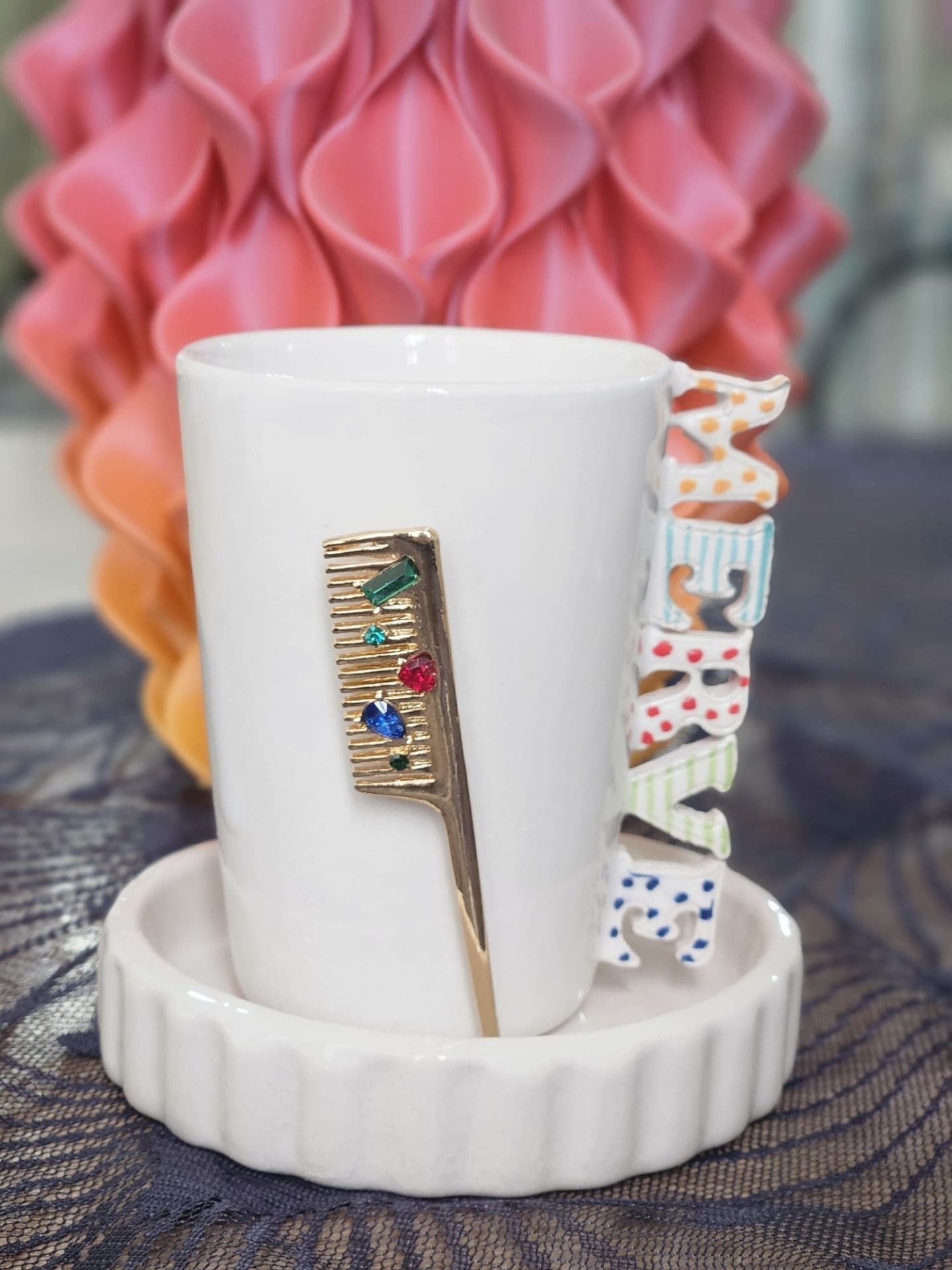 El Yapımı İsimli Kuaförlere Özel Taşlı Tarak Figürlü Fincan