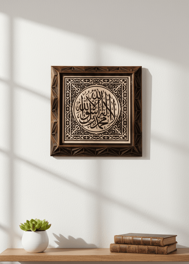 Bu ürün, İslami Kelime-i Tevhid yazılı ahşap duvar tablosu arayanlar için özel olarak tasarlanmış dekoratif bir duvar dekorasyon parçasıdır. Kelime-i Tevhid’in taşıdığı derin anlam, doğal ahşabın sıcak dokusu ile birleşerek hem göze hitap eden hem de manevi olarak güçlendiren bir atmosfer oluşturur. Duvarınızda sadece bir yazı değil, baktıkça anlamı hatırlatan ve iç dünyaya dönmeyi sağlayan güçlü bir hatırlatma yer alır.