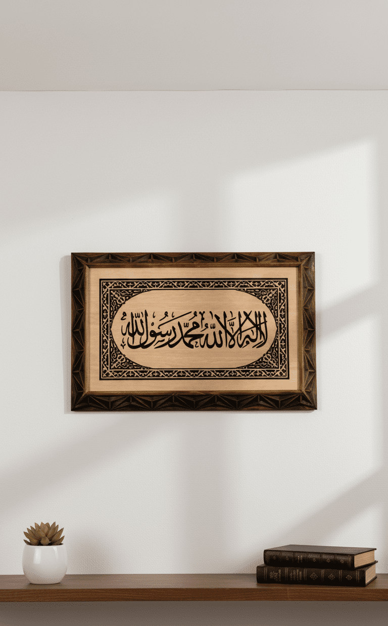 Bu ürün, özellikle İslami tablo arayanlar için tasarlanmış Kelime-i Tevhid yazılı ahşap duvar tablosudur. Hat sanatı ile süslenmiş Kelime-i Tevhid yazısı, doğal ahşabın sıcak dokusu ile birleşerek hem göze hitap eden hem de manevi derinliği güçlü bir duvar dekoru ortaya çıkarır. Tevhid inancının özünü taşıyan bu ifade, duvarınızda yalnızca dekoratif bir unsur değil, her bakıldığında anlamı hatırlatan güçlü bir mesaj olarak yer alır. Bu yönüyle ürün, İslami duvar dekorasyonu içinde öne çıkan özel bir İslami tablo niteliği taşır.