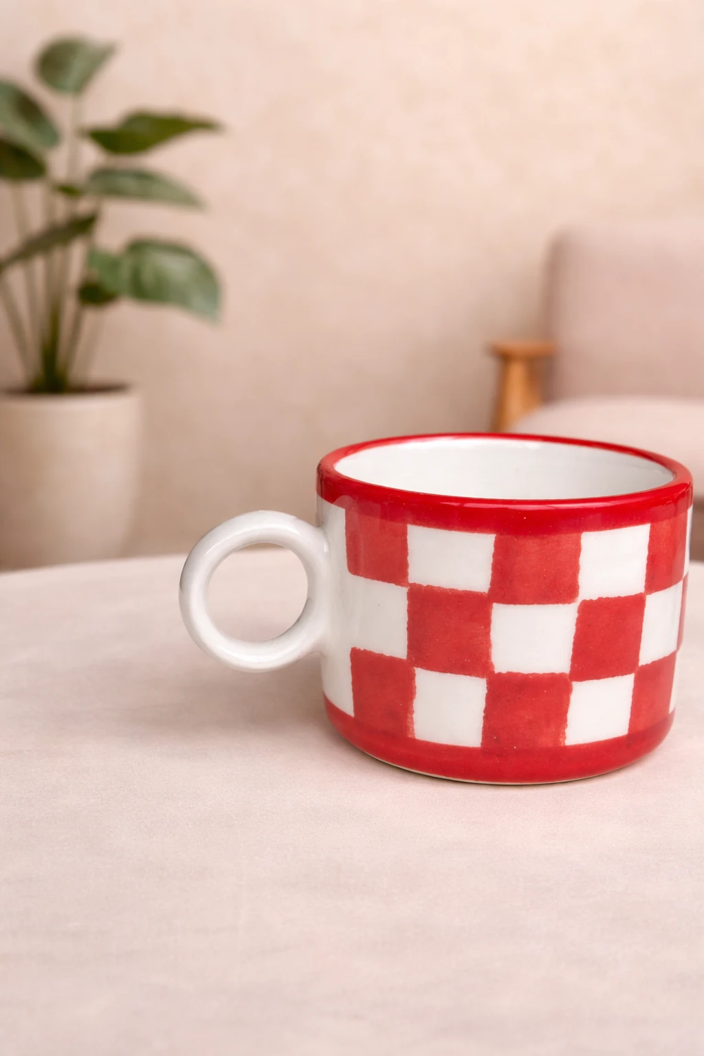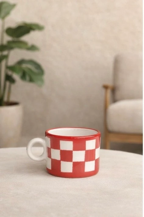 Kırmızı Dama Desenli El Yapımı Seramik Mug – 160 ml