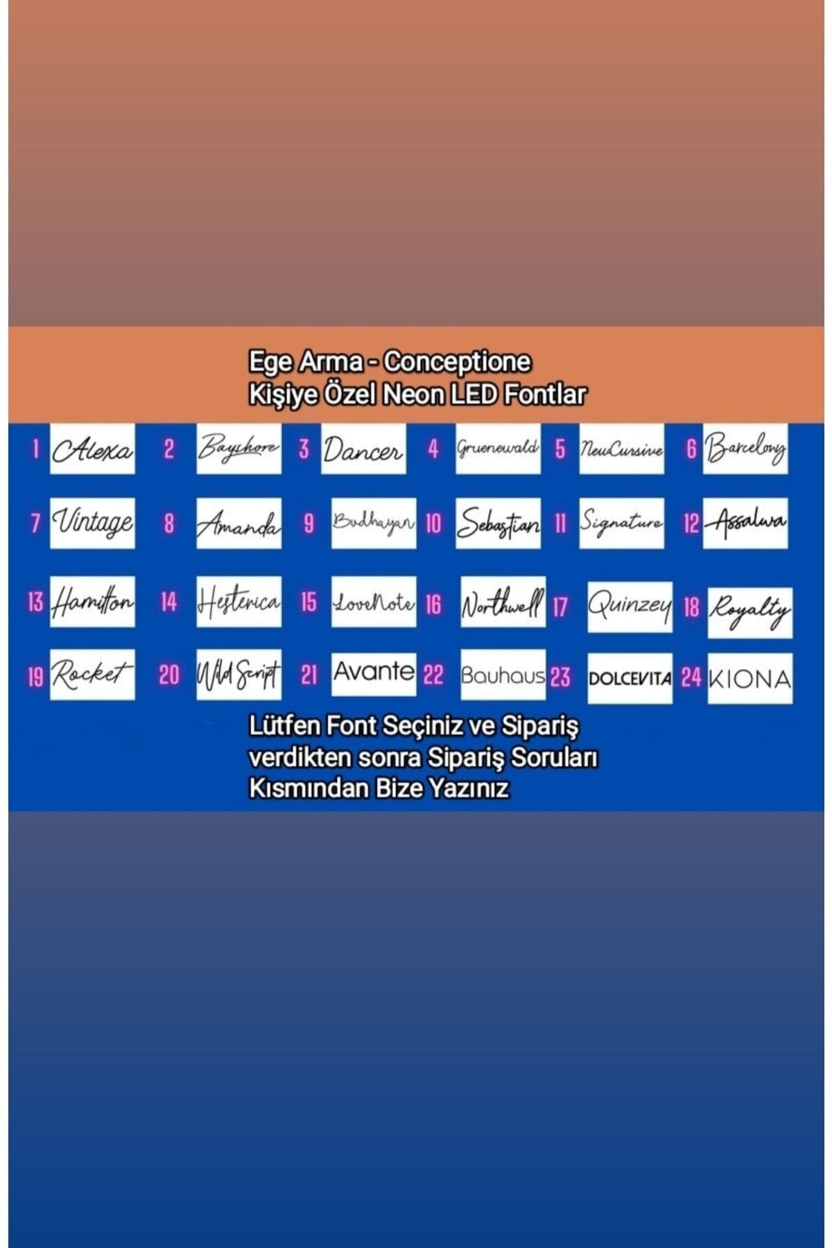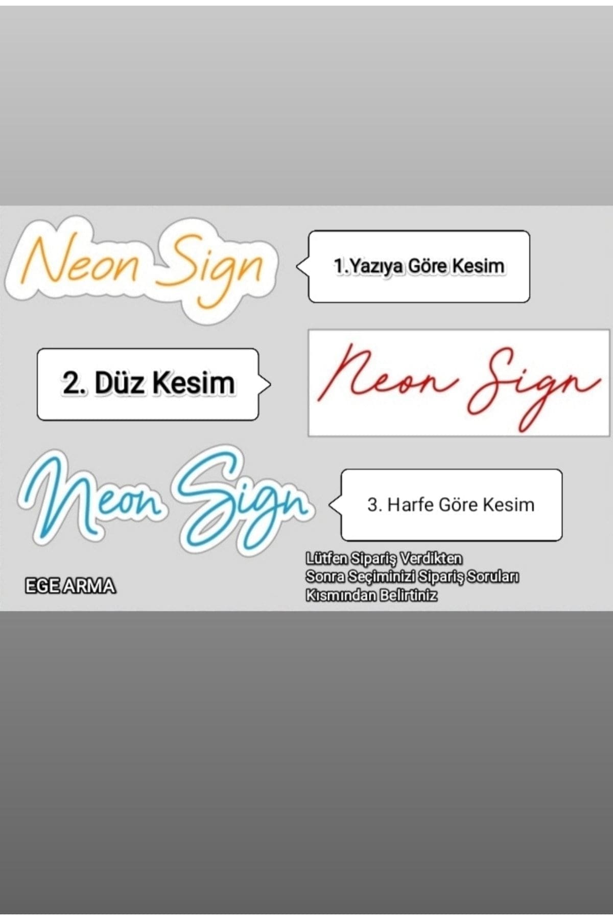 Ürün ölçüleri 30 cm. ; 3 Harf Desteklenmektedir. ; Şeffaf Pleksi Malzeme Üzerine Lazer Kazıma Tekniğiyle Neon Ledler El işçiliği ile Montaj Yapılmaktadır. ; Kişiye Özel Tasarım için Lütfen EGE ARMA Reklam Tanıtım / Conceptione ile iletişime geçiniz. ; Enerji tasarruflu led teknolojisinde üretilen yenilikçi bir aydınlatma sistemidir. ; İç hem ve dış mekanlar için uyarlanmıştır. ; Beyaz, sarı, mavi, pembe, kırmızı, mor, turkuaz renkleri mevcuttur. ; Özel neon led tabelalarımız, ev dekorunuz için mükemmel bir ışık dokunuşudur. ; Çocuk veya bebek yatak odaları, oturma ve yatak odaları, ofis, düğün ve partileriniz için mükemmel bir detay. ; Hem iç mekanda hem de dış mekanda kullanılabilir. ; Uzun vadede daha ucuz enerji tüketim maliyetleri vardır. ; Yüksek parlaklık ve yüksek kontrasta sahiptir. ; Düşük güç tüketimi ve düşük ısı yayılımı. ; Bakıma ihtiyaç duymaz. ; 12V adaptör ile gönderilmektedir. (Tak ve çalıştır ) kolaylığına sahiptir. ; Bu ürün EGE ARMA Reklam tarafından gönderilecektir. Conceptione bir EGE ARMA Reklam Markasıdır. Lütfen EGE ARMA ve Conceptione Markaları haricinde satın aldığınız ürünlere dikkat ediniz. Farklı firmalar üzerinden alınan siparişlerde sorumluluk kabul etmiyoruz. ;