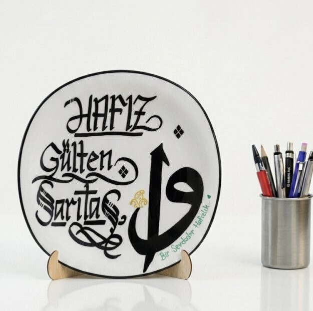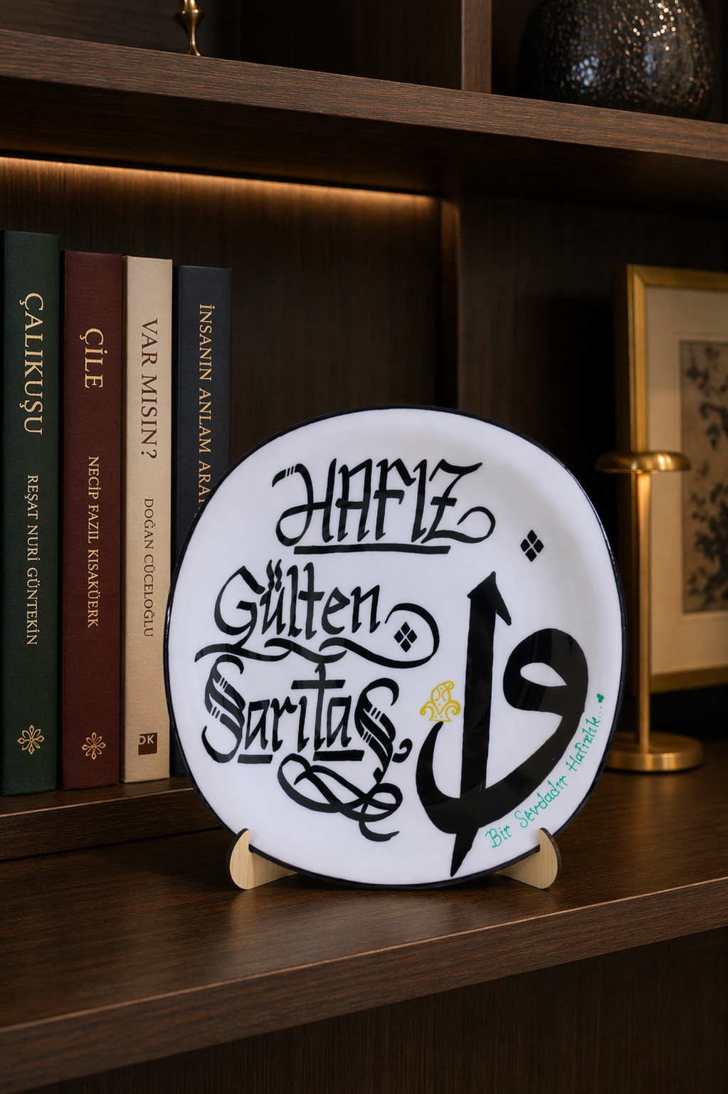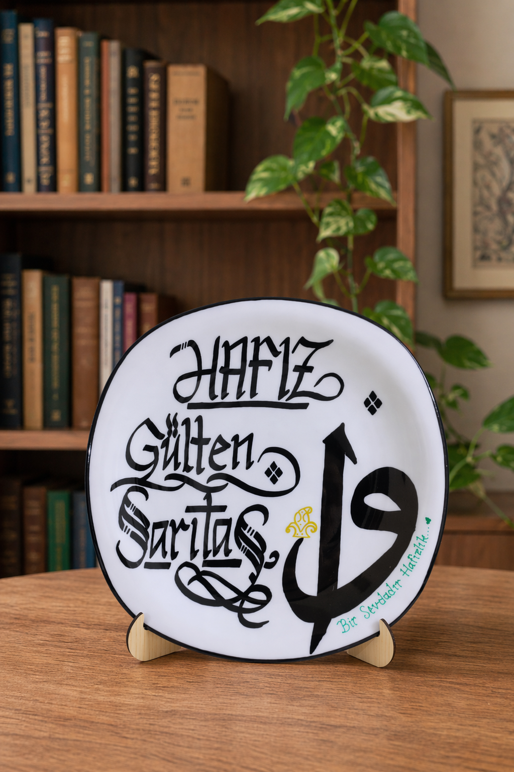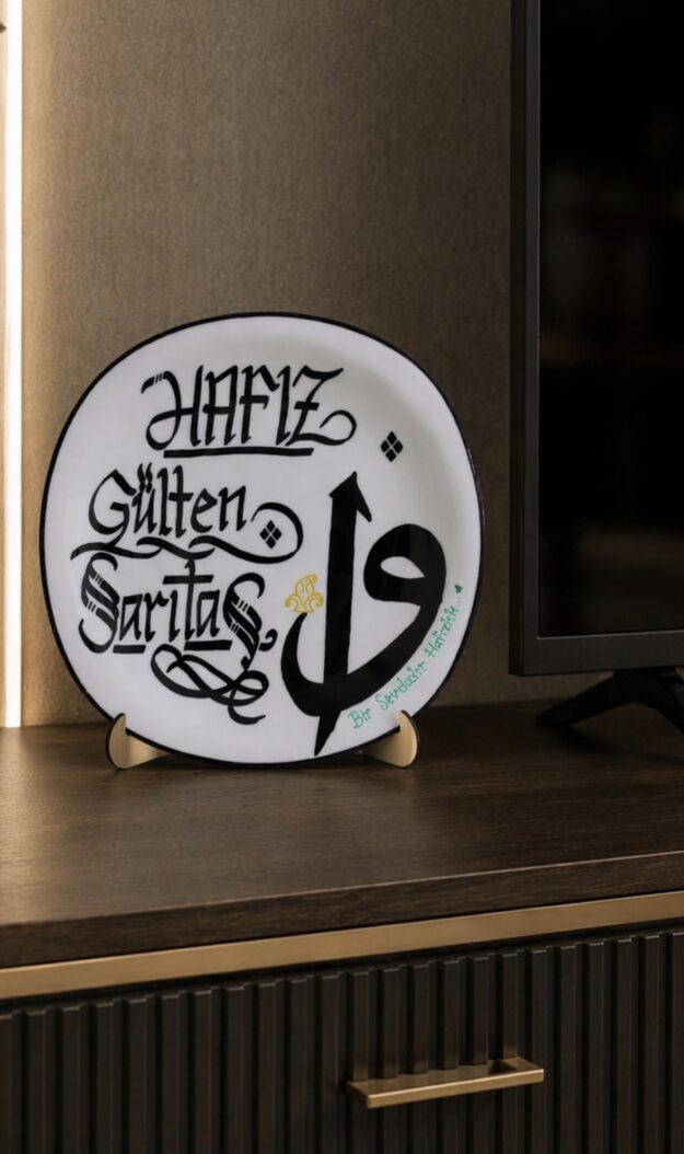 Evinizin atmosferini değiştirecek, sadece size özel bir sanat eserine ne dersiniz? 25 cm genişliğindeki asil porselen tabağımız, kaligrafinin büyüleyici çizgileriyle yeniden hayat buluyor.
