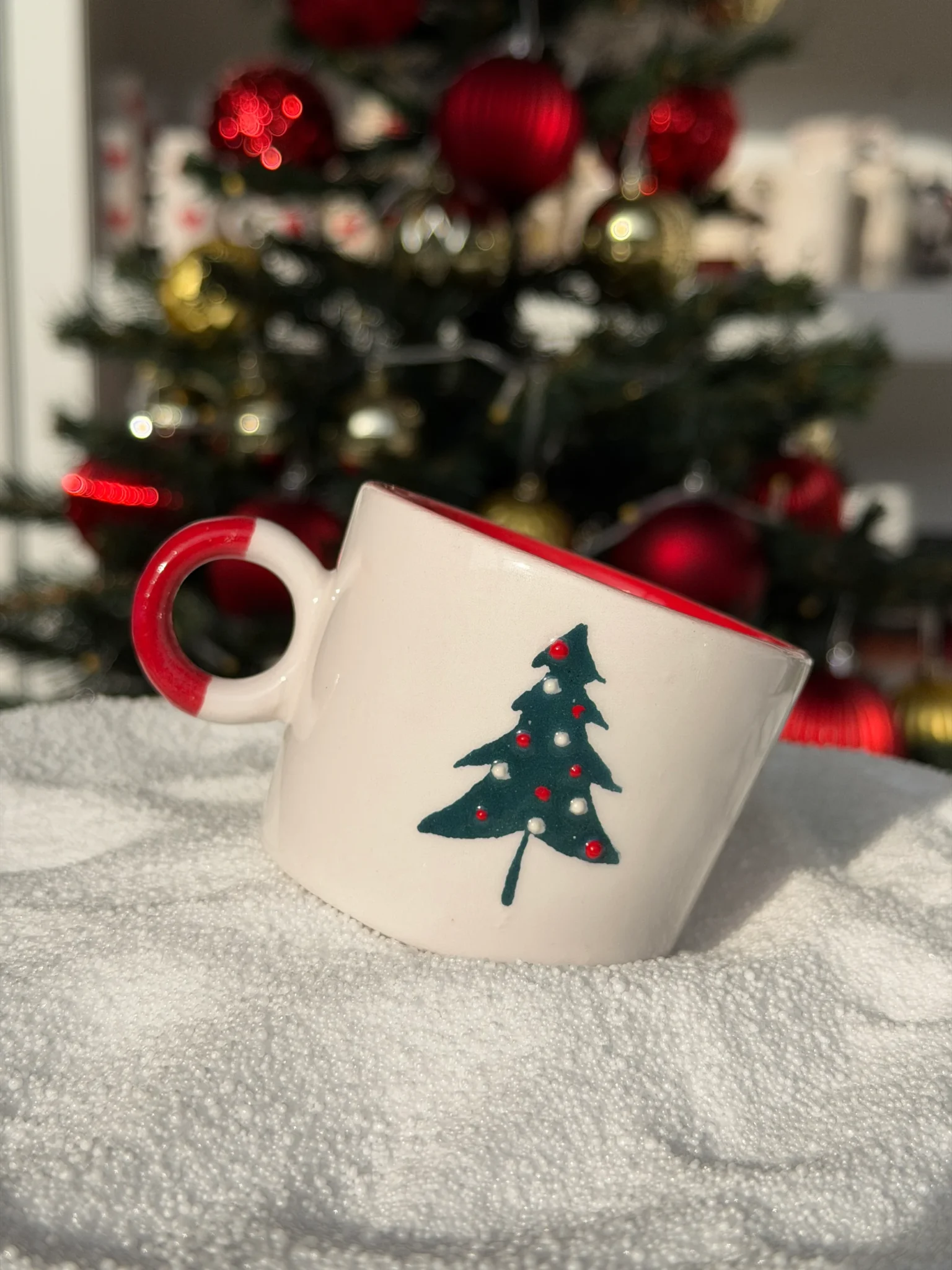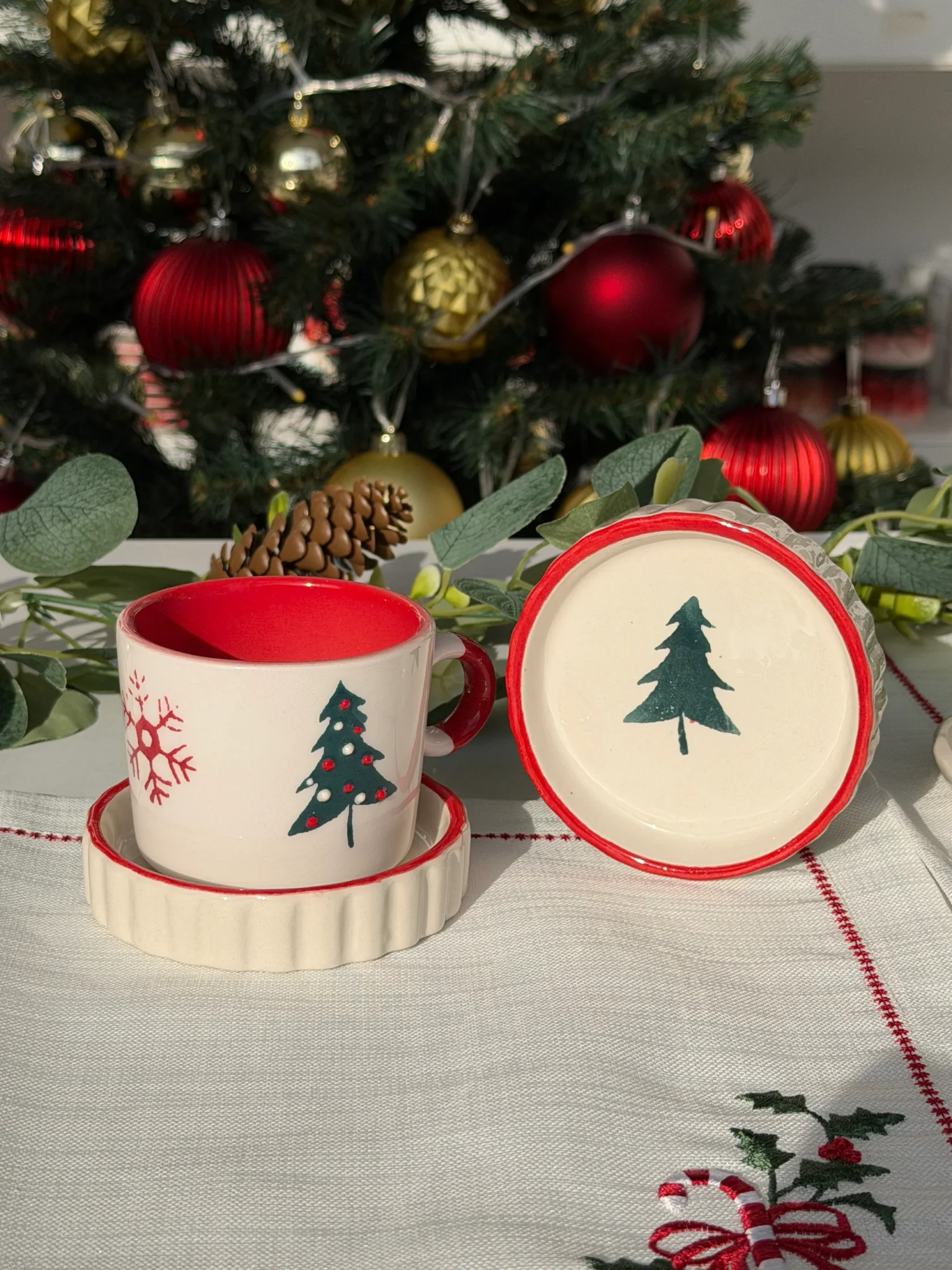 Yeni yılın sıcak ve neşeli atmosferini sofranıza taşıyan el yapımı seramik kupa, tamamen özenle şekillendirilmiş ve tek tek elde boyanmıştır. Üzerindeki çam ağacı ve kar tanesi motifleri, yılbaşı ruhunu hissettirirken kupanın içindeki canlı kırmızı ton, kışın soğuk günlerinde kahve ve çay molalarınıza ekstra bir enerji